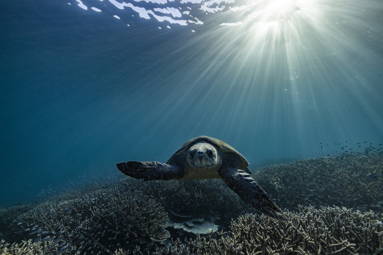 Auch Reptilien findet man im Great Barrier Reef: 17 verschiedene Schildkrötenarten leben hier – vom großartigen grünen Meeresschildkröten bis zur winzigen hawaiianischen Keilschildkröte. Sie leben entweder am Strand oder schwimmen in den Gewässern des Riffs auf der Suche nach Nahrung oder einem guten Platz zum Nisten oder um Sonnenbad zu nehmen.