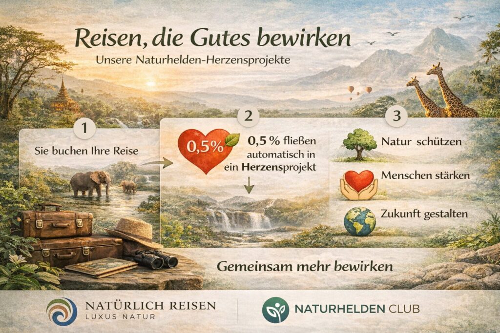 Reisen eröffnet neue Perspektiven – auf die Welt, auf andere Kulturen und auf die Natur. Gleichzeitig möchten wir mit unseren Reisen auch etwas zurückgeben. Deshalb unterstützen unsere Tourdesigner persönliche Herzensprojekte, die ihnen besonders wichtig sind. Mit jeder gebuchten Reise fließen 0,5 % automatisch in eines dieser Projekte. So entsteht aus vielen kleinen Beiträgen eine Wirkung, die Menschen, Natur und Gemeinschaften vor Ort stärkt. Unsere Herzensprojekte reichen von Natur- und Artenschutz über Bildungsinitiativen bis hin zu sozialen Projekten in verschiedenen Regionen der Welt. Sie stehen für das, was uns als Reiseveranstalter besonders am Herzen liegt: verantwortungsvolles Reisen, echte Begegnungen und eine Zukunft, in der Tourismus positiv wirkt.