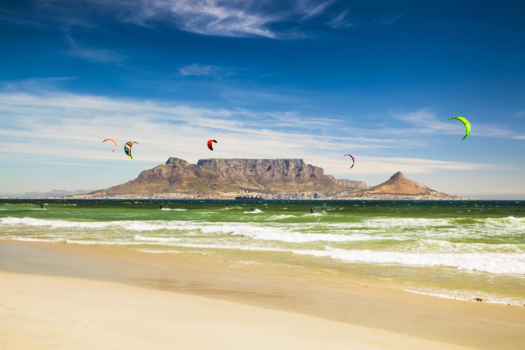 Warmer Wind im Sommer, wunderschöner Blick auf den Tafelberg, große Wellen und kräftige Winde.