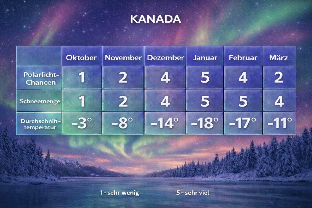 Auch bei uns besteht die Möglichkeit, dieses Naturschauspiel zu erleben – vor allem in den nördlicheren Regionen. Laut Experten ist die Wahrscheinlichkeit im Jahr 2026 besonders hoch, in Deutschland Nordlichter zu sehen- und das bis nach Österreich. Auch in der Schweiz kommt es- allerdings äußerst selten- zu Polarlichtern. Doch selbst in Deutschland oder Österreich ist solch ein Ereignis seltener als in den nördlicheren Ländern und kann nicht so stark beobachtet werden. Wer ein intensives Polarlichterlebnis schon lange auf seiner Bucketlist stehen hat, für den ist Norwegen daher ein Muss. Mindestens genauso kräftig und häufig kann das Farbenspektakel aber auch in Kanada beobachtet werden. Das Land liegt im nördlichen Teil des amerikanischen Kontinents und hat eine extrem lange Nacht in den Wintermonaten, was es einem ermöglicht, die Polarlichter für eine lange Zeitspanne zu beobachten.