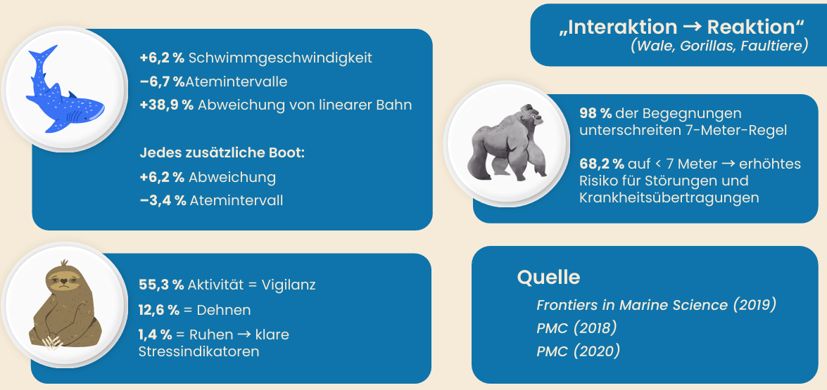 Eine 2016 veröffentlichte Metaanalyse der NOAA (National Oceanic and Atmospheric Administration) bestätigt, dass Whale-Watching-Aktivitäten bei verschiedenen Walarten zu erhöhten Stressreaktionen und Veränderungen im Bewegungsverhalten führen (20).