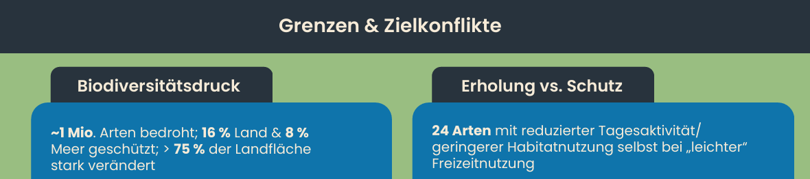 Der Report belegt, dass Freizeitaktivitäten in Schutzgebieten über 24 Arten hinweg zu messbaren negativen Effekten führten, darunter reduzierte Aktivitätsmuster und die veränderte Nutzung von Lebensräumen⁴.