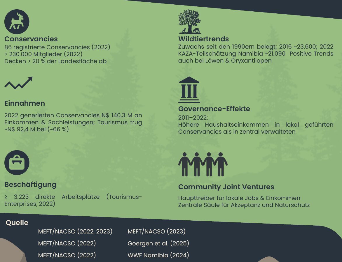 In Namibia belegen aktuelle Studien, dass lokale Governance und partizipatives Management die Einkommen aus Naturschutzprojekten deutlich steigern und gleichzeitig den Schutz von Wildtieren verbessern⁸.