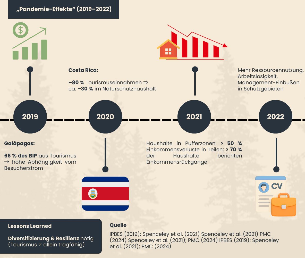 Die Ausnahmesituation im Tourismus während der Corona Pandemie zeigte die hohe wirtschaftliche Abhängigkeit vieler Schutzgebiete von touristischen Einnahmen: In Costa Rica kam es zu einem Einbruch der Besucherzahlen um 80 %, mit erheblichen Folgen für die Finanzierung von Biodiversität und Artenschutz²³.