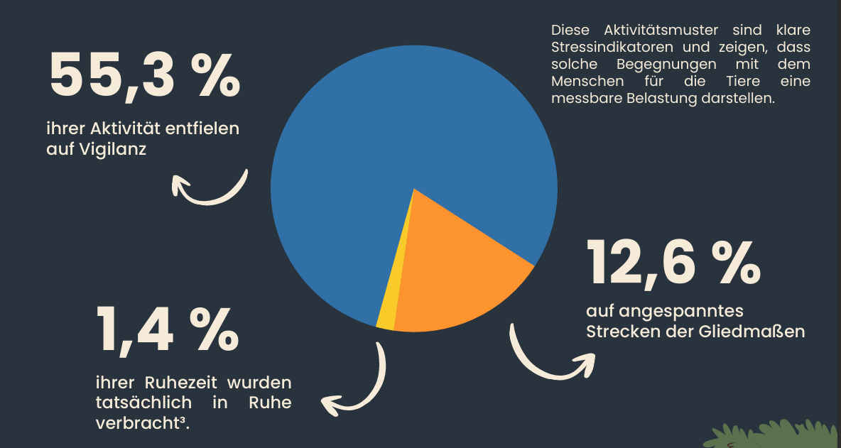 Eine aktuelle Scientific Reports-Analyse aus dem Jahr 2023 zeigt über 24 Arten hinweg konsistente negative Effekte der Freizeitnutzung, darunter insbesondere eine reduzierte Tagesaktivität (19).
