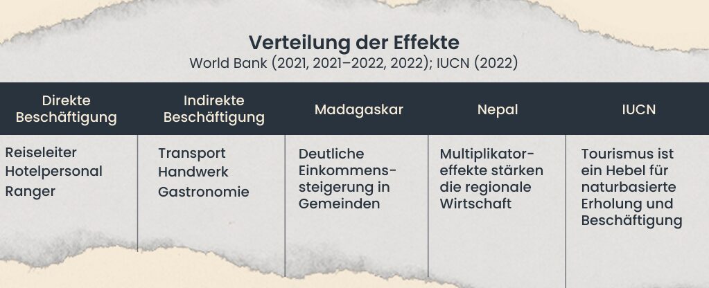 Darüber hinaus zeigt eine Policy-Studie der IUCN (2022), dass Tourismus in das Konzept der „Nature-based Recovery to Jobs“ eingebettet werden kann. Der Bericht argumentiert, dass Investitionen in naturnahe Wirtschaftssektoren – einschließlich Tourismus – ein effektiver Hebel für Beschäftigungssicherung in Post-Krisenzeiten sind.